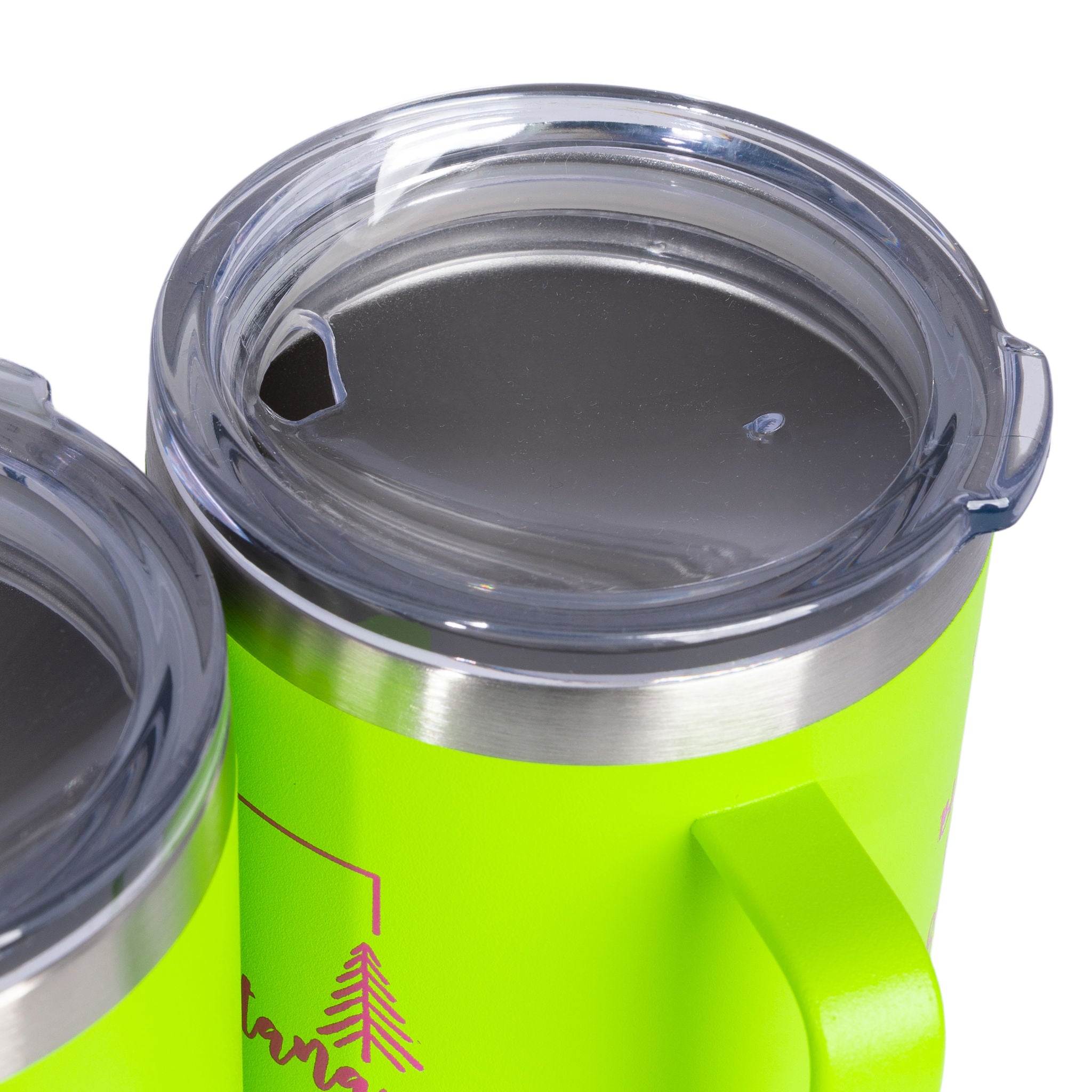 This 14 oz. travel camp mug is constructed of double-wall 18/8 stainless steel thermal with copper vacuum insulation, a stainless steel rim, clear drink-thru press-fit lid, and a powder-coated finish. Hand washing recommended. PART# SP030